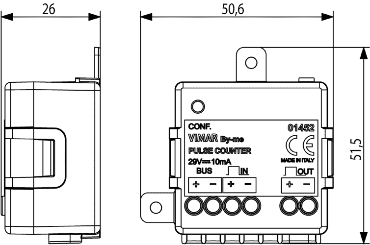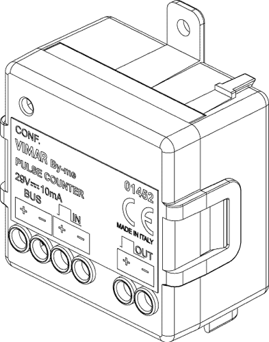 01452 Интерфейс-счетчик импульсов Vimar Arke для снятия показаний с устройств, оснащенных импульсным выходом, например, счетчиков электроэнергии, воды, газа; устанавливается встраиванием (подсоединение с задней стороны)
