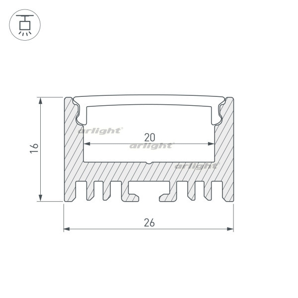 Подвесной профиль для лент шириной до 20мм. Анодированный алюминий. Подходит Экран ARH-WIDE-(F)-H10, Подвес для ARH-LINE-1726, LINE-1716. Размеры 26х16х2000 мм. Цена за 1м.