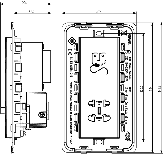 19291.B Розетка для бритв 230 В~ 50/60 Гц, с разделительным трансформатором 20 ВА, 230 В~ и 120 В~ выходы Белый Arké Vimar
