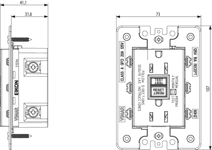 дифференциальным автоматическим выключателем GFCI - 3 модуля. Глубина: 31,6 мм