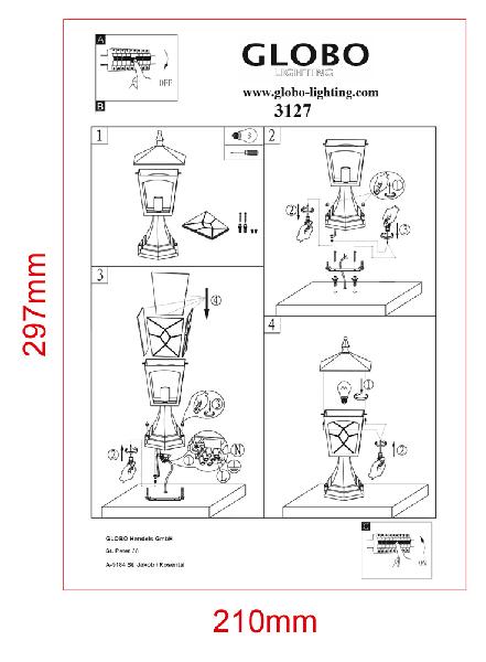 Уличный столб 3127 изготавливается брендом Globo, относящаяся к коллекции Atlanta. Габаритные размеры: длина 375 мм, высота 185 мм, ширина 185 мм.