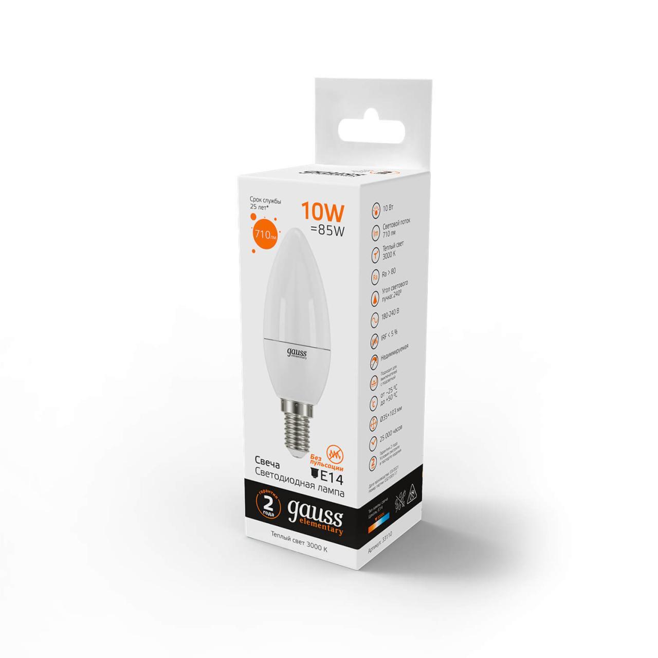 Светодиодная лампа Gauss Elementary Candle 10W E14 2700K 33110 имеет основные параметры: цоколь E14, мощность 10 Вт, цветовая температура 3000, световой поток 710 лм/м.