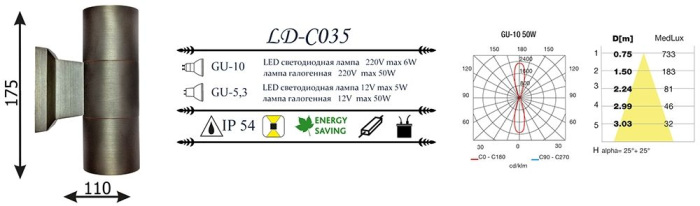 Осветительный прибор выполнен в стиле Модерн. Используются лампы с цоколем GU10, количеством 1 шт. Цвет модели LD-C035: Бронза.