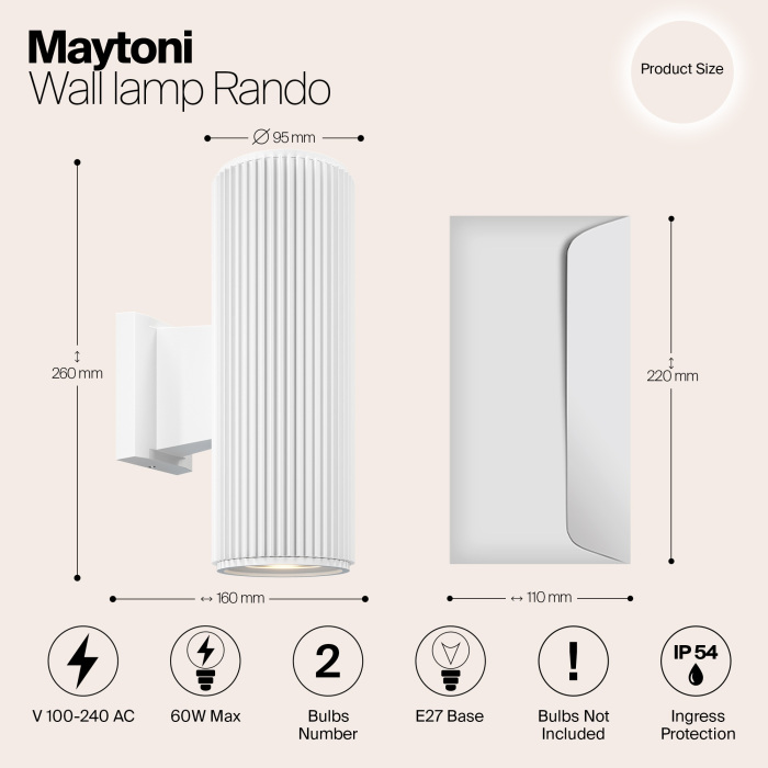 Уличный настенный светильник O419WL-02W – это продукция бренда Maytoni и принадлежит коллекции Rando. Габариты: длина 260 мм, высота 260 мм, ширина 160 мм, диаметр 95 мм. Уличное освещение Maytoni O419WL-02W созданы с применением высококачественных и прочных материалов, таких как: металл, плафон - Металл.