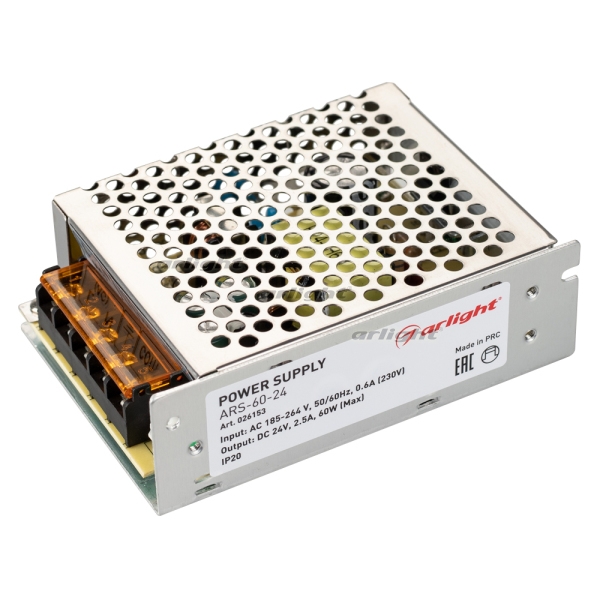 Блок питания ARS 026153 Arlight обладает следующими основными характеристиками:, мощность 60 Вт, напряжение 24 В , влагозащита IP20.