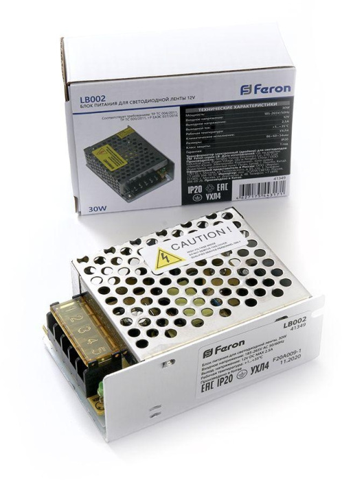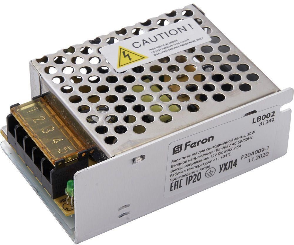 Блок питания для светодиодной ленты LB002 41349 Feron обладает следующими основными характеристиками:, мощность 30 Вт, влагозащита IP20.