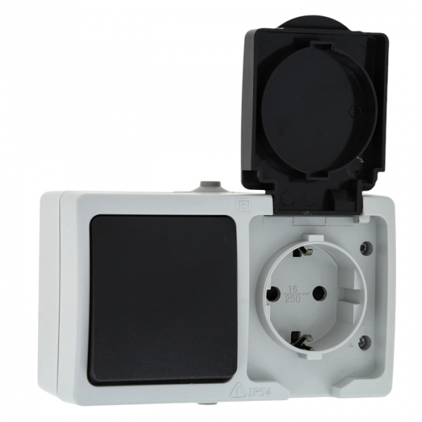 Блок розетка-выкл. 1-кл. 16А с/з с крышкой IP54 сер. с защ. штор. EKF Венеция EVRV16-050-30-540