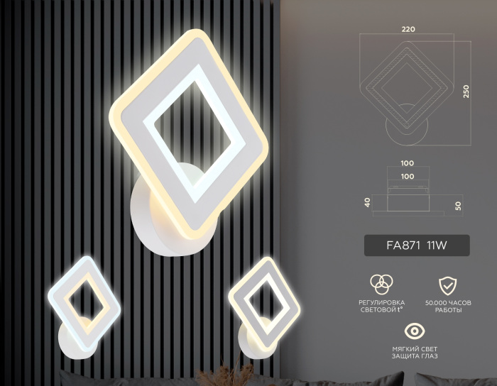 Осветительный прибор выполнен в стиле Современный. Применяются лампы цоколя LED мощностью 9 Вт. Основной цвет модели FA871: Белый.