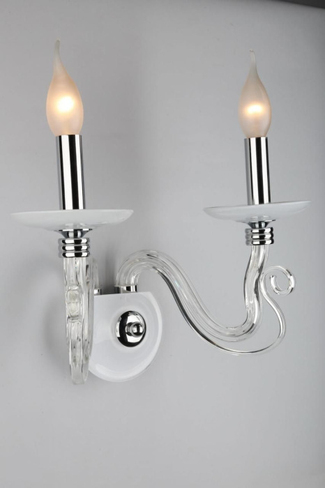 Осветительный прибор выполнен в стиле Арт-Деко. Задействуются лампы цоколя E14 мощностью 80 Вт, в количестве 2 шт. Основной цвет модели OML-79301-02: Прозрачный,Хром.