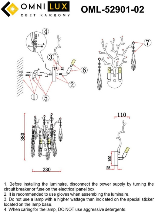 Осветительный прибор выполнен в стиле Арт-Деко. Применяются лампочки с цоколем G9 мощностью 10 Вт, в количестве 2 шт. Основной цвет модели OML-52901-02: Прозрачный.