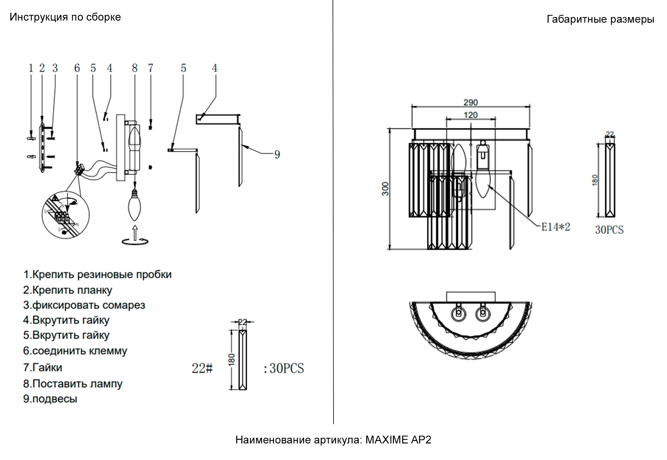 Задействуются лампы цоколя E14 мощностью 40 Вт, в количестве 2 шт. Основной цвет модели MAXIME AP2 BLACK: Прозрачный.
