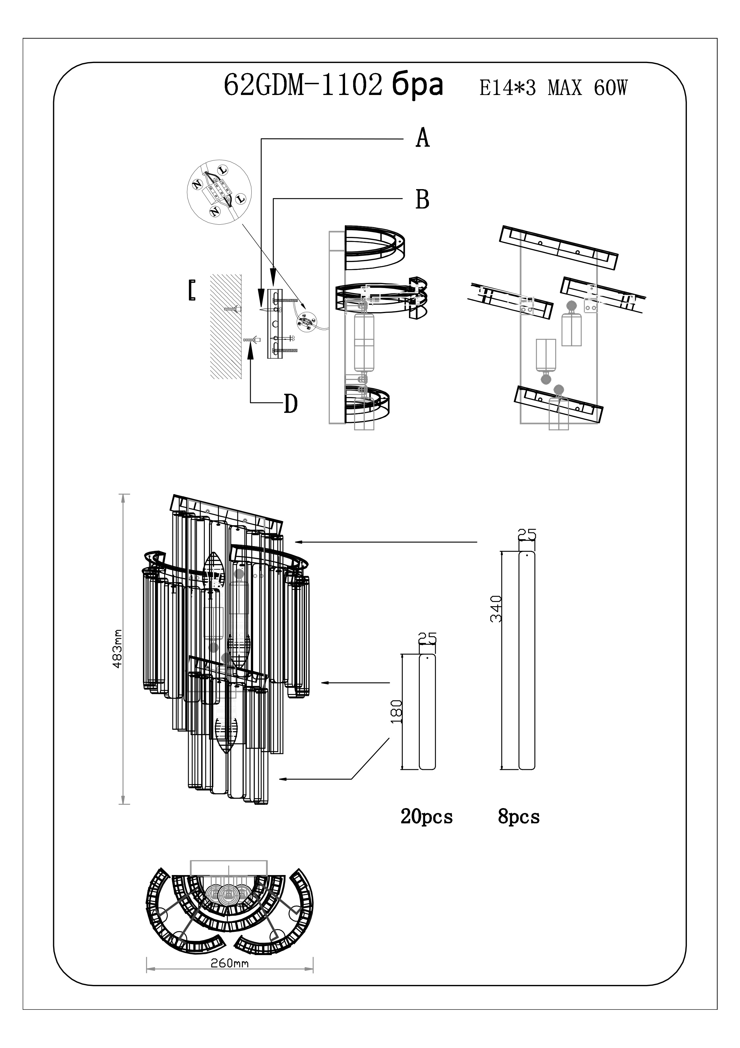 Осветительный прибор выполнен в стиле Арт-Деко. Подходят лампы цоколя E14 мощностью 25 Вт, в количестве 3 шт. Основной цвет модели 62GDM-1102: Прозрачный.