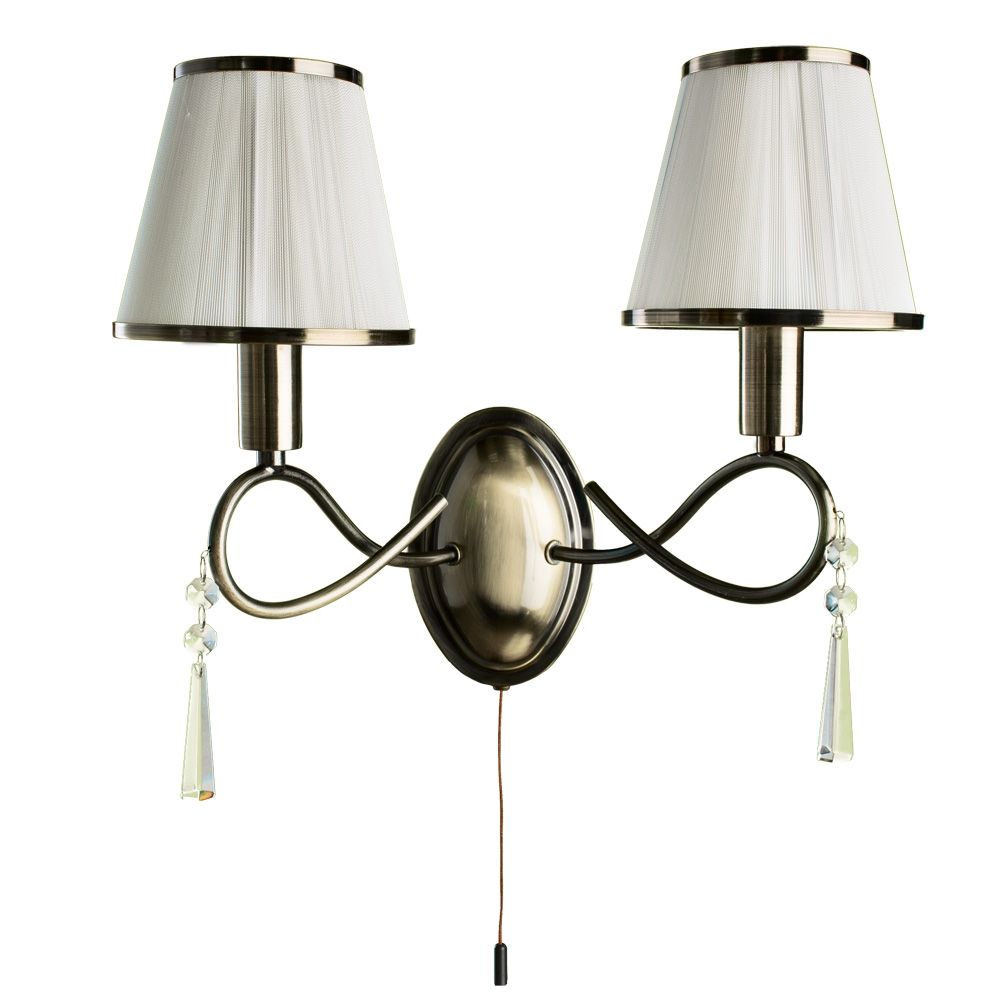 Осветительный прибор сделан в стиле Классический. Задействуются лампы цоколя E14 мощностью 80 Вт, количеством 2 ед. Основной цвет модели A1035AP-2AB: Белый.