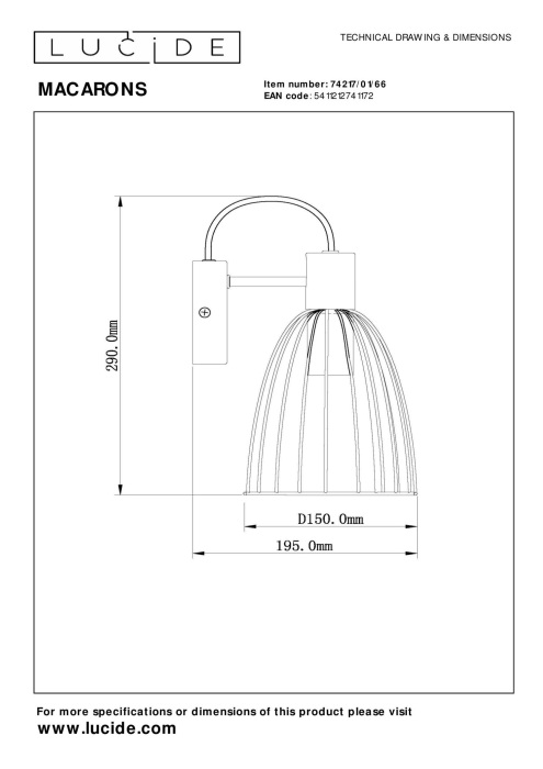 Бра 74217/01/66 производится брендом Lucide, относящаяся к коллекции Macarons. Габариты: длина 150 мм, высота 290 мм, ширина 195 мм. Бра Lucide 74217/01/66 выполнены из высококачественных и прочных материалов: металл, плафон - Металл.