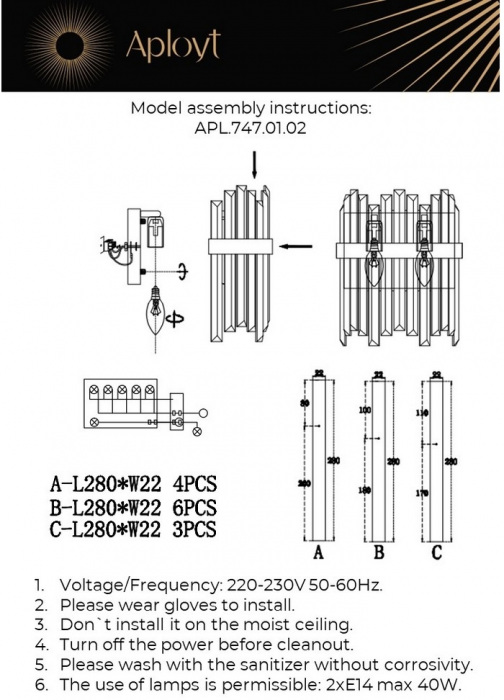 Осветительный прибор сделан в стиле Классический. Задействуются лампы цоколя E14 мощностью 80 Вт, количеством 2 ед. Основной цвет модели APL.747.01.02: Прозрачный.