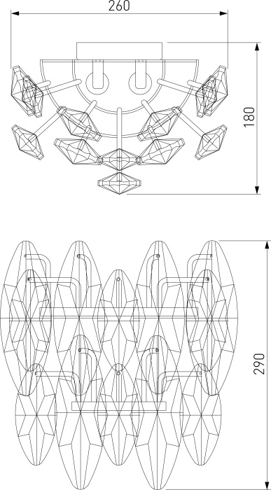 Осветительный прибор разработан в стиле Арт-Деко. Применяются лампочки цоколя E14 мощностью 80 Вт, в количестве 2 ед.