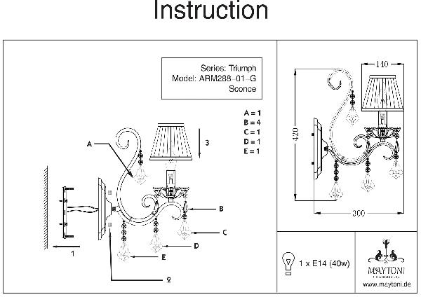 Осветительный прибор выполнен в стиле Классический. Подходят лампочки с цоколем E14 мощностью 60 Вт, в количестве 1 шт. Основной цвет модели ARM288-01-G: Бежевый.