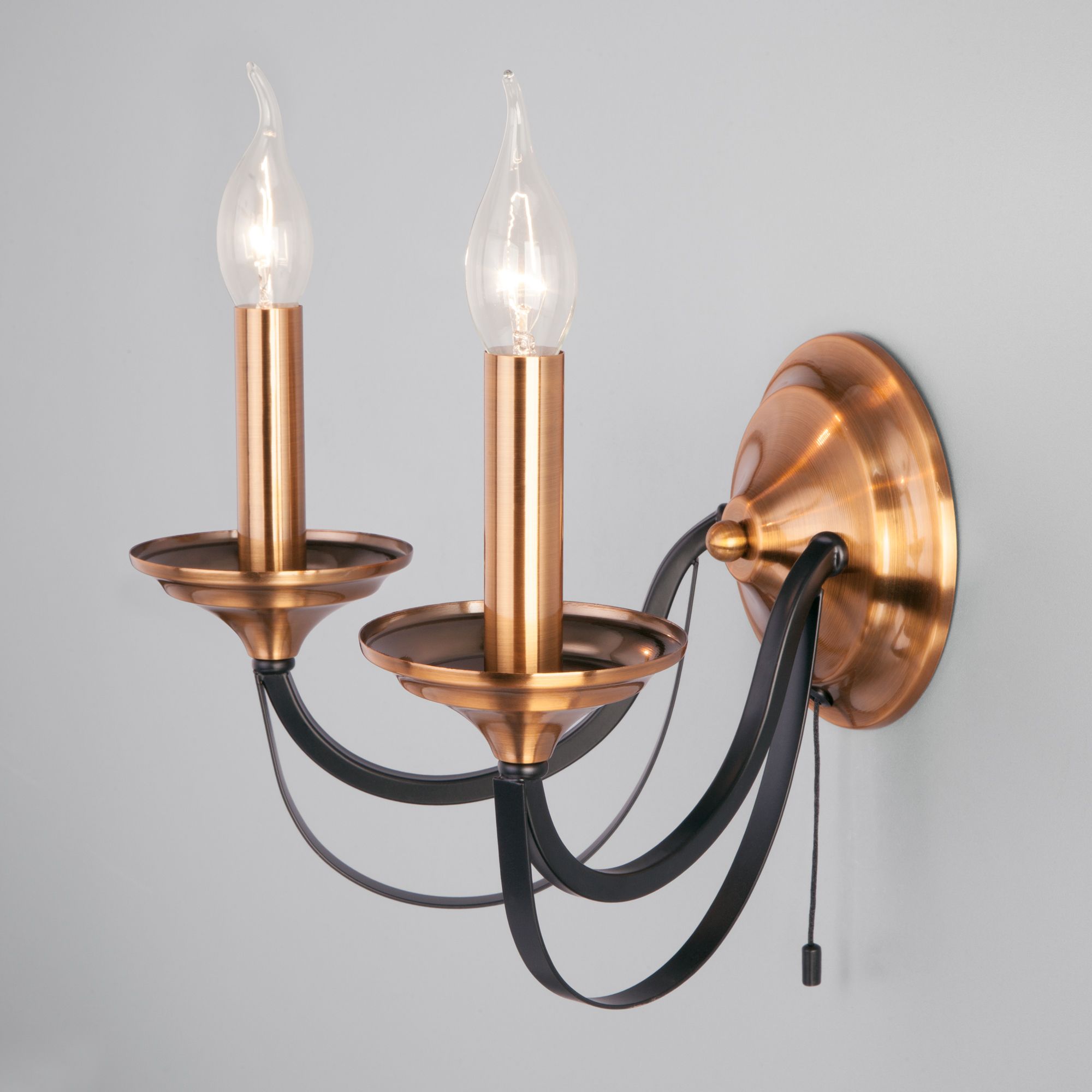 Осветительный прибор разработан в стиле Готика. Применяются лампочки с цоколем E14 мощностью 60 Вт, в количестве 2 шт. Основной цвет модели a045209: Медь.