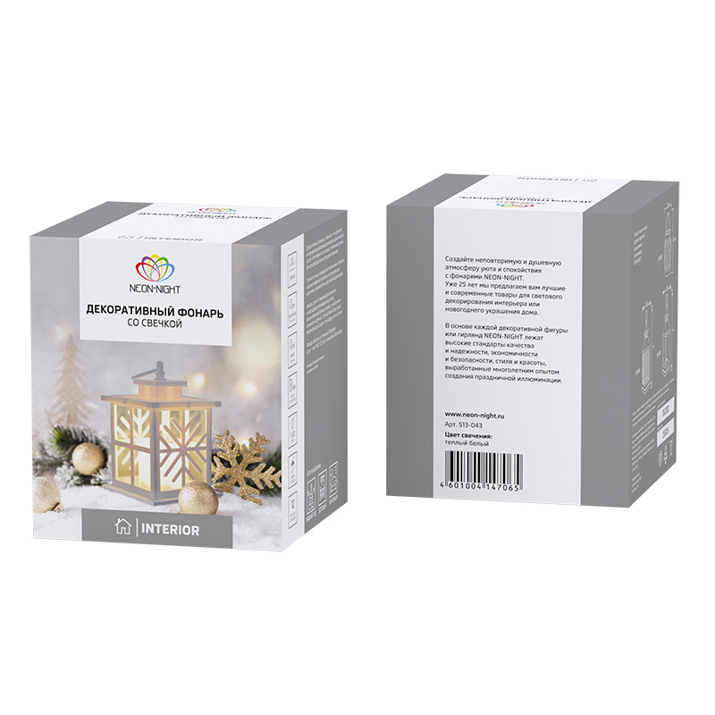 Декоративный фонарь со свечкой, белый корпус со снежинкой, размер 12х12х18 см, цвет теплый белый NEON-NIGHT 513-043 обладает следующими основными характеристиками:, мощность 0,1 Вт Вт, влагозащита IP20.