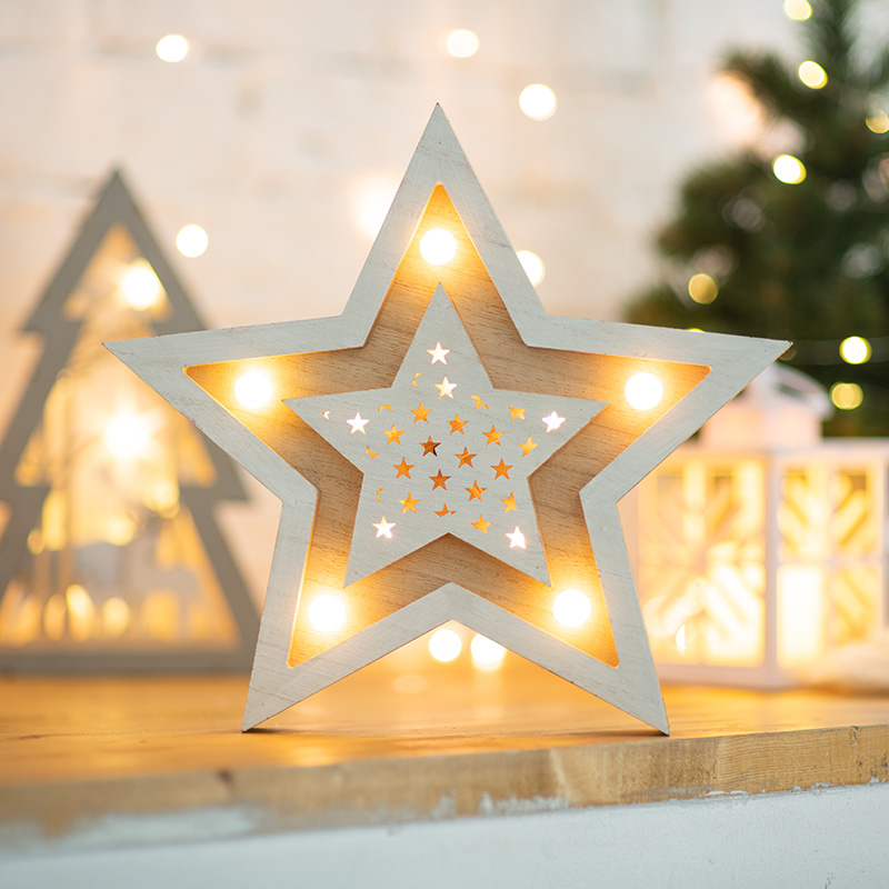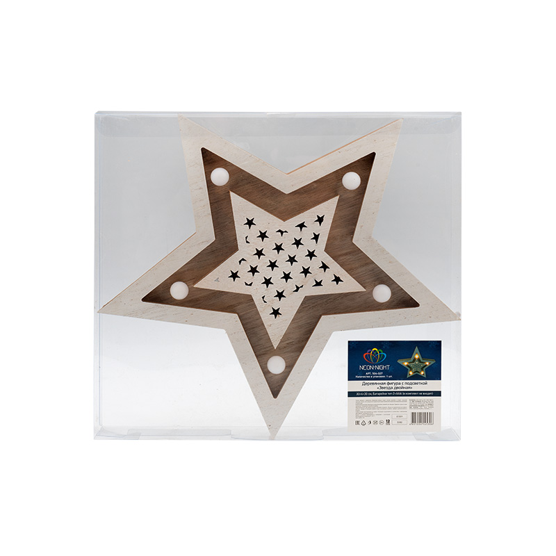 Деревянная фигура с подсветкой Звезда двойная 30х4х30 см NEON-NIGHT 504-027 имеет основные параметры:, влагозащита IP20.