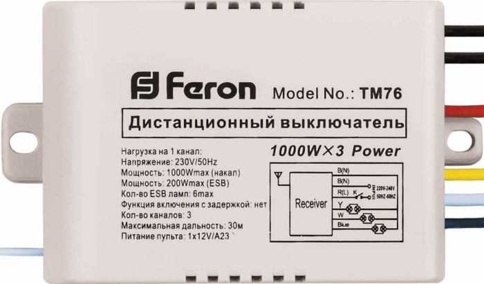 Выключатель дистанционный 230V 1000W 3-хканальный 30м с пультом управления Feron 23345 обладает следующими основными характеристиками:, влагозащита IP20, цвет Белый.