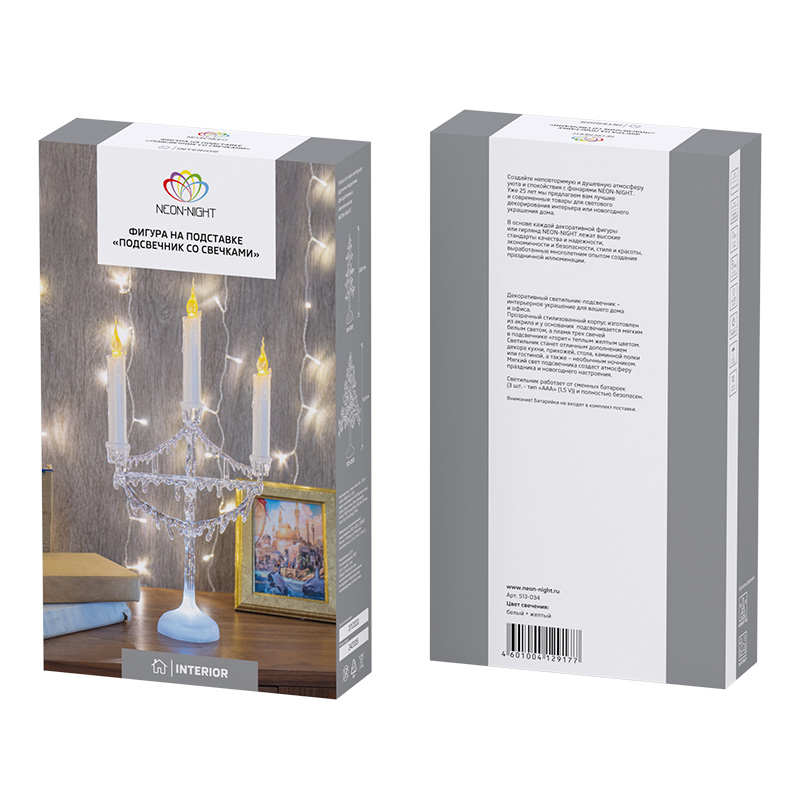 Фигура на подставке Подсвечник со свечками 25 см NEON-NIGHT 513-034 имеет основные параметры:, мощность 0,5 Вт Вт, влагозащита IP20.