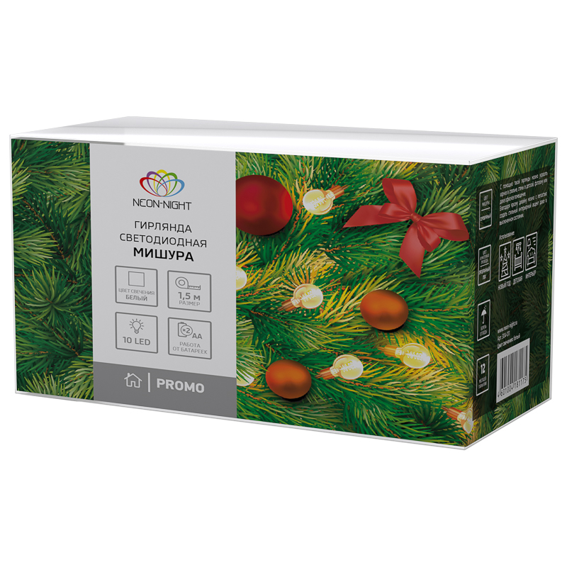 Гирлянда светодиодная Мишура серебряная 10 LED 1,5 м, прозрачный ПВХ, белый свет свечения, 2 х АА (батарейки не в комплекте) NEON-NIGHT NEON-NIGHT 304-011 имеет основные параметры:, влагозащита IP20.