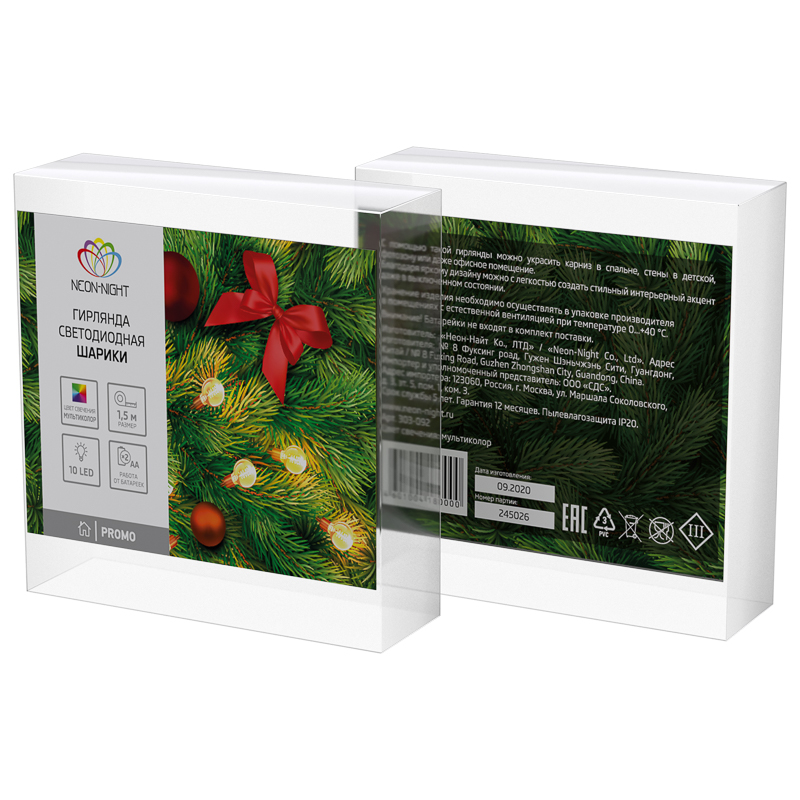 Гирлянда светодиодная Шарики 1.5 м, 10 LED, прозрачный ПВХ, цвет свечения мультиколор, 2 х АА (батарейки не в комплекте) NEON-NIGHT NEON-NIGHT 303-092 соответствует параметрам:, влагозащита IP20.