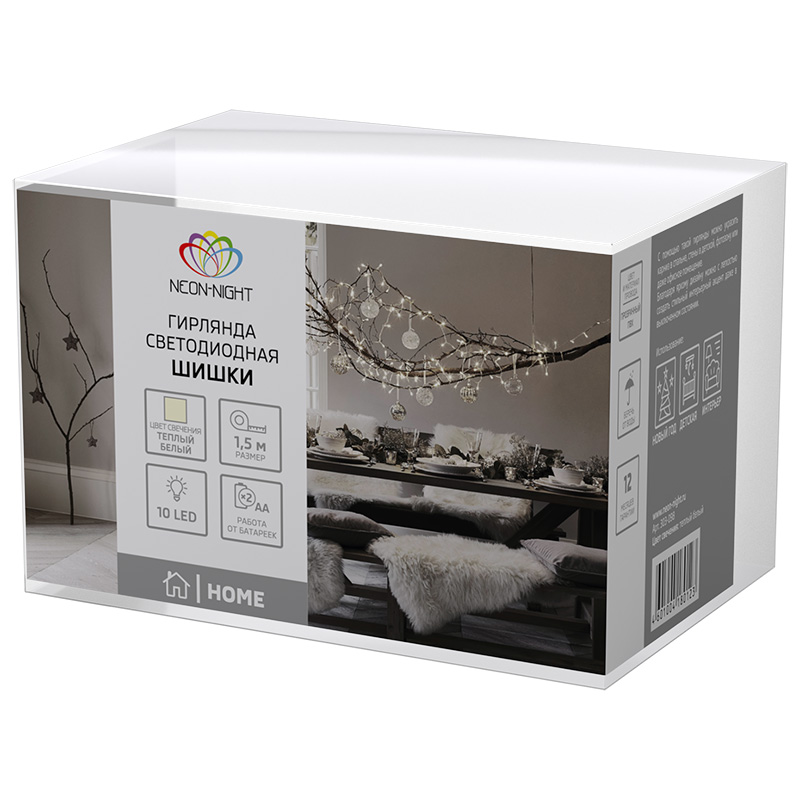 Гирлянда светодиодная Шишки 1.5 м, 10 LED, прозрачный ПВХ, цвет свечения теплый белый, 2 х АА (батарейки не в комплекте) NEON-NIGHT NEON-NIGHT 303-098 имеет основные параметры:, влагозащита IP20.
