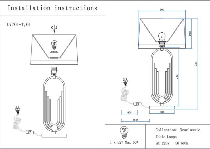 Осветительный прибор выполнен в стиле Модерн. Задействуются лампы цоколя E27 мощностью 40 Вт, в количестве 1 шт. Основной цвет модели 07701-T,20(01): Белый.
