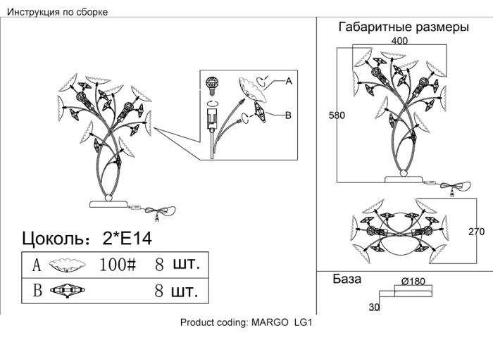 Осветительный прибор выполнен в стиле Флористический. Используются лампочки с цоколем E14 мощностью 80 Вт, в количестве 2 шт.