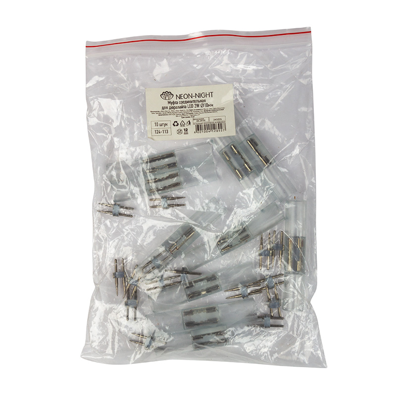Коннектор для двухжильного дюралайта ∅10мм (цена за 1 шт.) NEON-NIGHT 124-113 обладает следующими основными характеристиками:, влагозащита IP44.