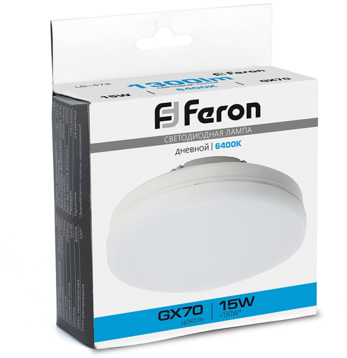 Лампочка светодиодная 48305 Feron соответствует параметрам: цоколь GX70, цветовая температура 6400, световой поток 1300 лм/м, напряжение 220 В .