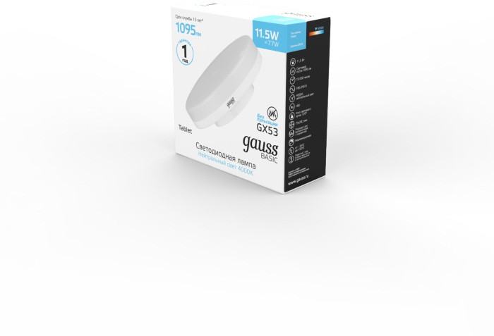 Лампочка светодиодная Basic 20849112 Gauss обладает следующими основными характеристиками: цоколь GX53, цветовая температура 3000, световой поток 1095 лм/м, напряжение 220 В , влагозащита IP20, цвет Белый.