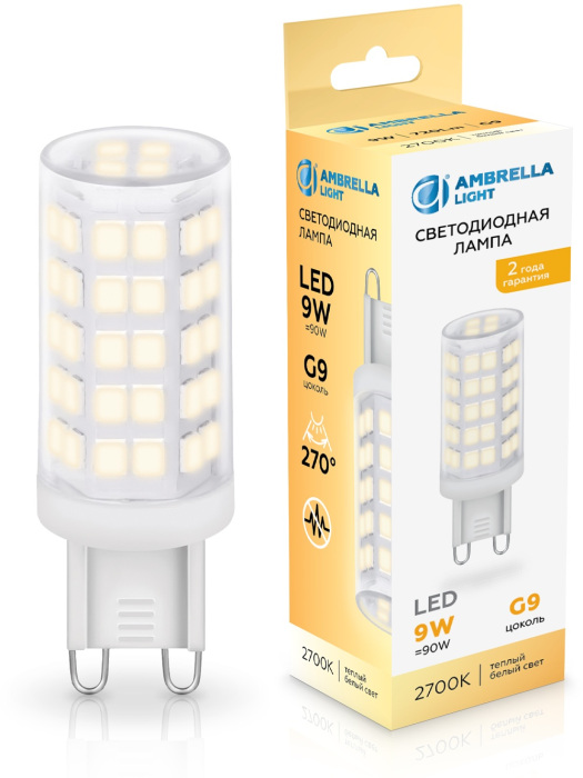 Лампочка светодиодная Bulbing 100903 Ambrella соответствует параметрам: цоколь G9, мощность 9 Вт, цветовая температура 2700, световой поток 720 лм/м, напряжение 220 В , влагозащита IP20, цвет Прозрачный.