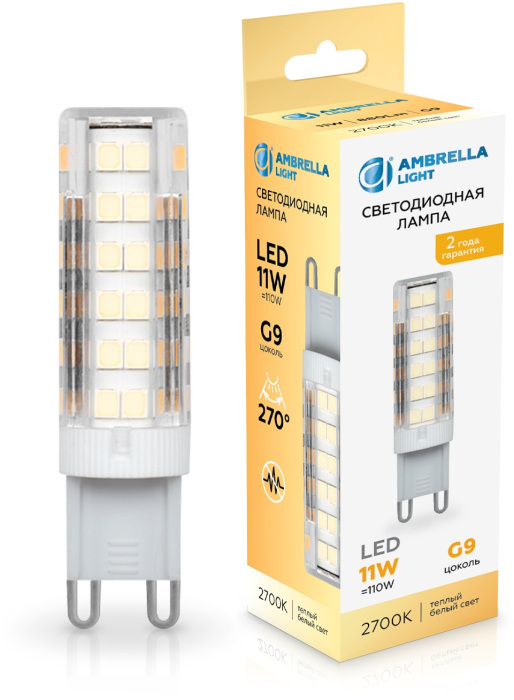 Лампочка светодиодная Bulbing 101103 Ambrella соответствует параметрам: цоколь G9, мощность 11 Вт, цветовая температура 2700, световой поток 880 лм/м, напряжение 220 В , влагозащита IP20, цвет Прозрачный.