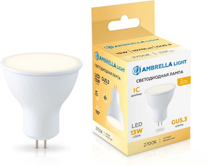 Лампочка светодиодная Bulbing 161303 Ambrella имеет основные параметры: цоколь GU5.3, мощность 13 Вт, цветовая температура 2700, световой поток 1070 лм/м, напряжение 220 В , влагозащита IP20, цвет Белый.