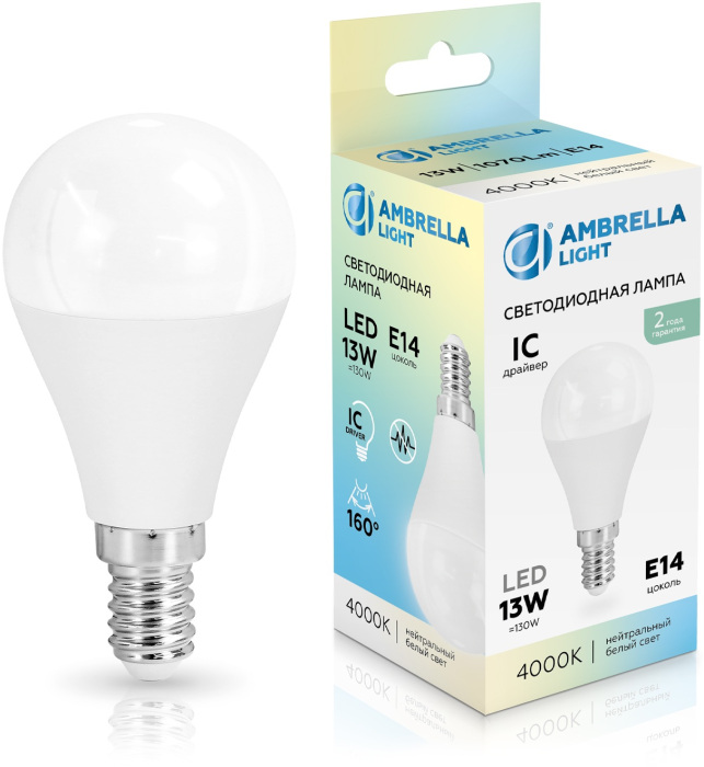 Лампочка светодиодная Bulbing 451314 Ambrella соответствует параметрам: цоколь E14, мощность 13 Вт, цветовая температура 4000, световой поток 1070 лм/м, напряжение 220 В , влагозащита IP20, цвет Белый.