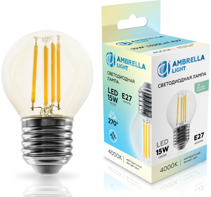 Лампочка светодиодная Bulbing 451524 Ambrella обладает следующими основными характеристиками: цоколь E27, мощность 15 Вт, цветовая температура 4000, световой поток 1320 лм/м, напряжение 220 В , влагозащита IP20, цвет Прозрачный.
