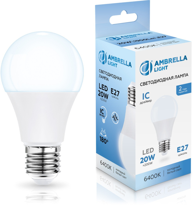 Лампочка светодиодная Bulbing 602006 Ambrella соответствует параметрам: цоколь E27, мощность 20 Вт, цветовая температура 6400, световой поток 1900 лм/м, напряжение 220 В , влагозащита IP20, цвет Белый.