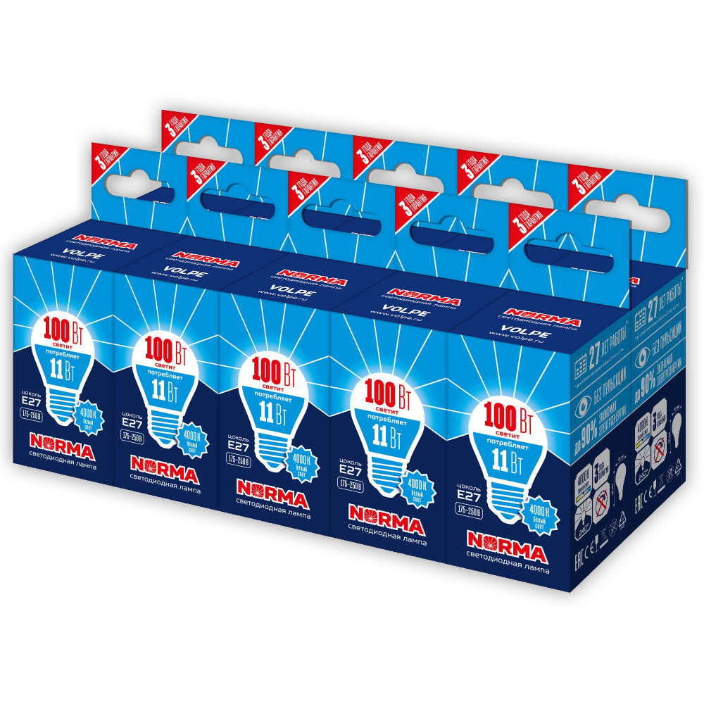 Лампочка светодиодная Norma LED-G45-11W/NW/E27/FR/NR Набор из 10штук Volpe имеет основные параметры: цоколь E27, мощность 11 Вт, цветовая температура 4000, световой поток 900 лм/м, напряжение 220 В .