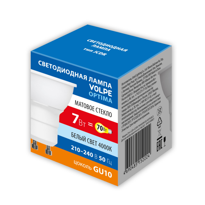 Лампочка светодиодная Optima LED-JCDR-7W/4000K/GU10/FR/SLS Volpe соответствует параметрам: цоколь GU10, цветовая температура 4000, световой поток 700 лм/м, напряжение 220 В .