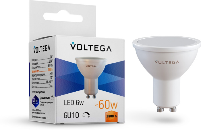 Лампочка светодиодная Simple 8457 Voltega соответствует параметрам: цоколь GU10, цветовая температура 2800, световой поток 600 лм/м, напряжение 220 В , влагозащита IP20.