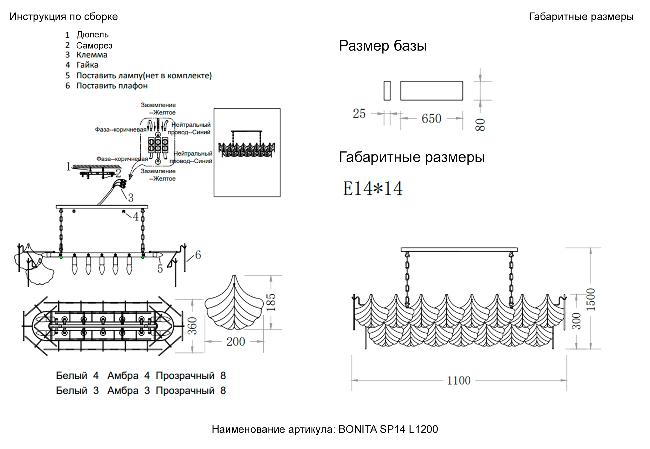 Подходят лампы цоколя E14 мощностью 60 Вт, в количестве 14 шт. Основной цвет модели BONITA SP14 L1200: Белый,Прозрачный,Янтарный.