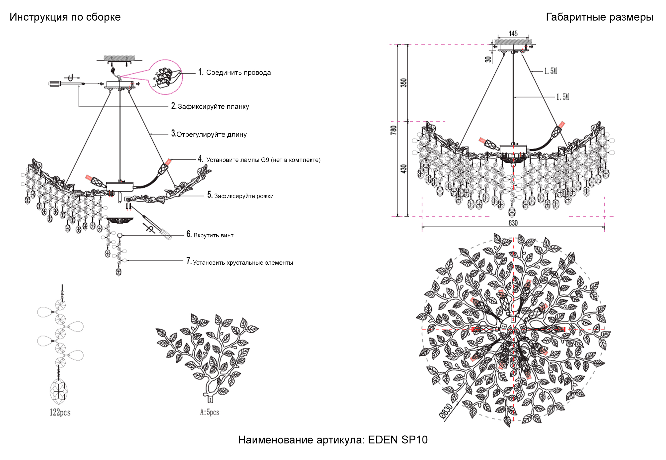 Подходят лампочки цоколя E14 мощностью 40 Вт, количеством 10 шт. Цвет модели EDEN SP10 GOLD: Золотой,Прозрачный.