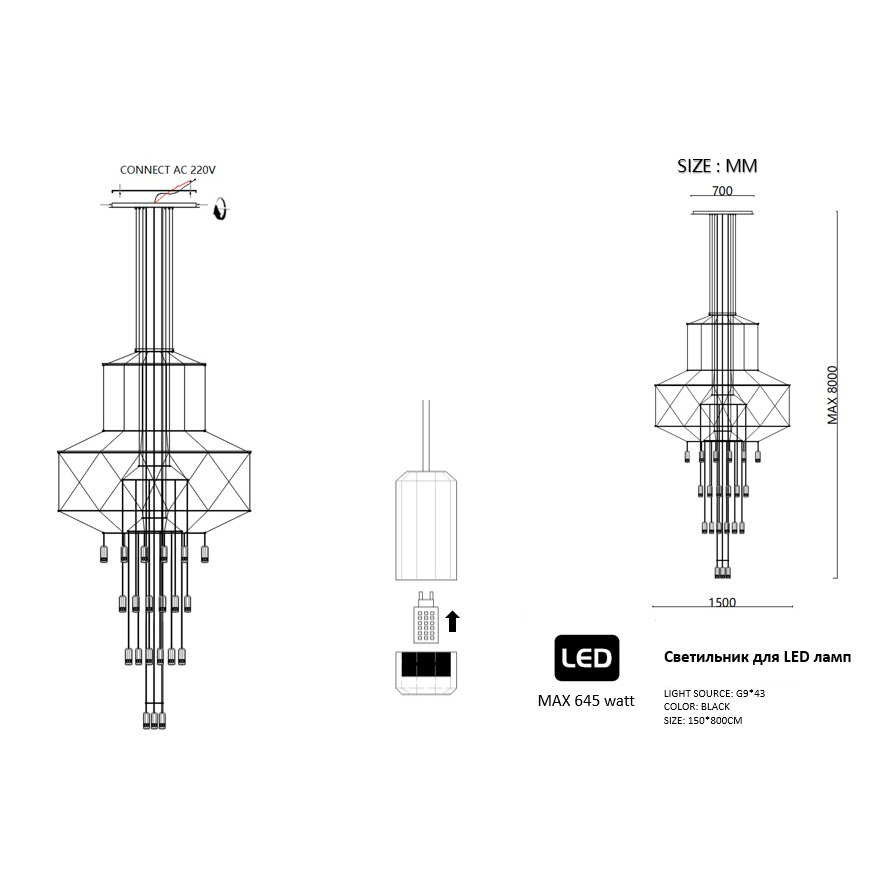 Осветительный прибор выполнен в стиле Дизайнерский. Применяются лампы с цоколем G9 мощностью 1720 Вт, количеством 43 шт. Цвет модели 75394-22: Чёрный.