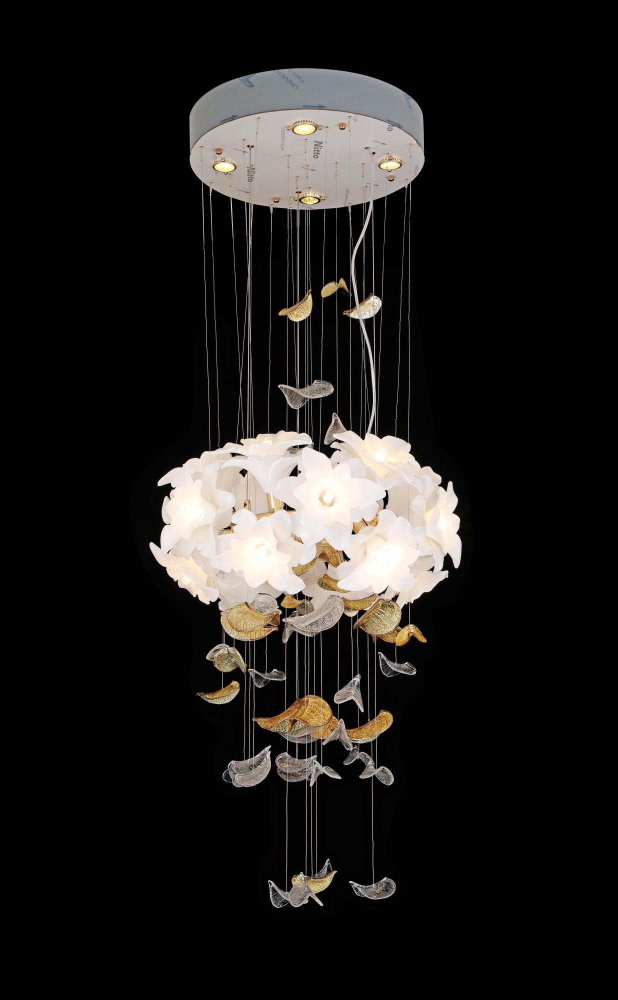 Осветительный прибор разработан в стиле Дизайнерский. Применяются лампочки с цоколем G9 мощностью 162 Вт, количеством 18 ед. Основной цвет модели F0124-23: Белый,Золотой.