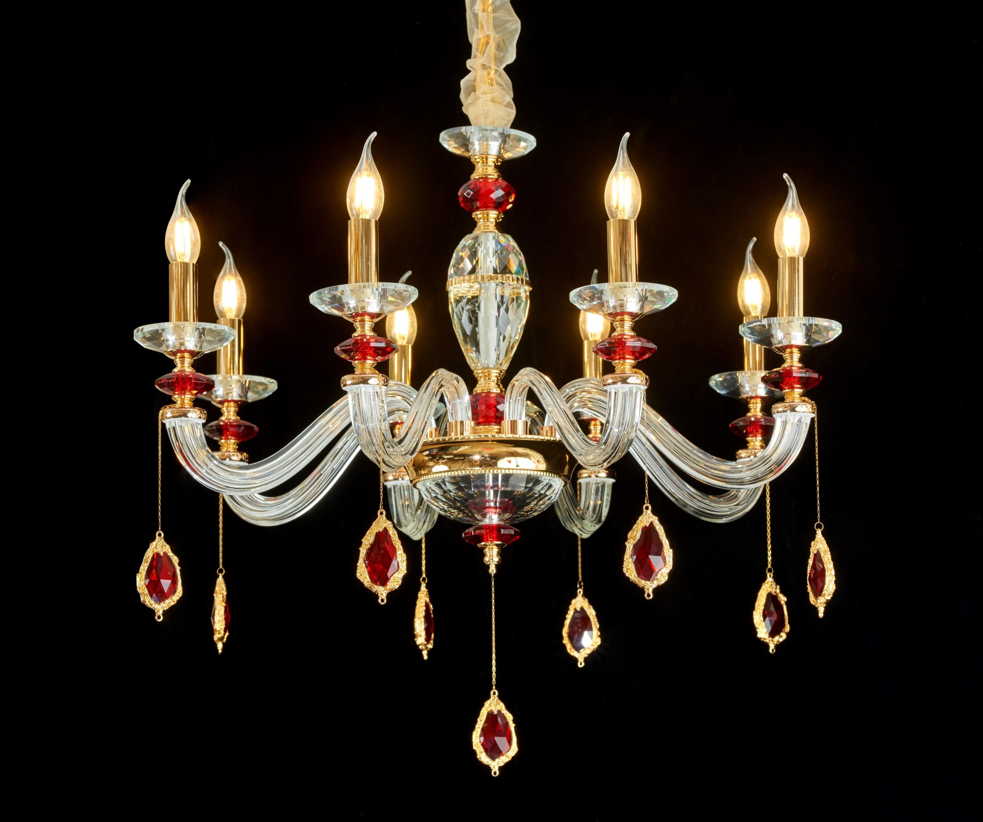 Люстра подвесная Alfa Light F2624-09 красная, хрустальная, рожковая, в виде свечей