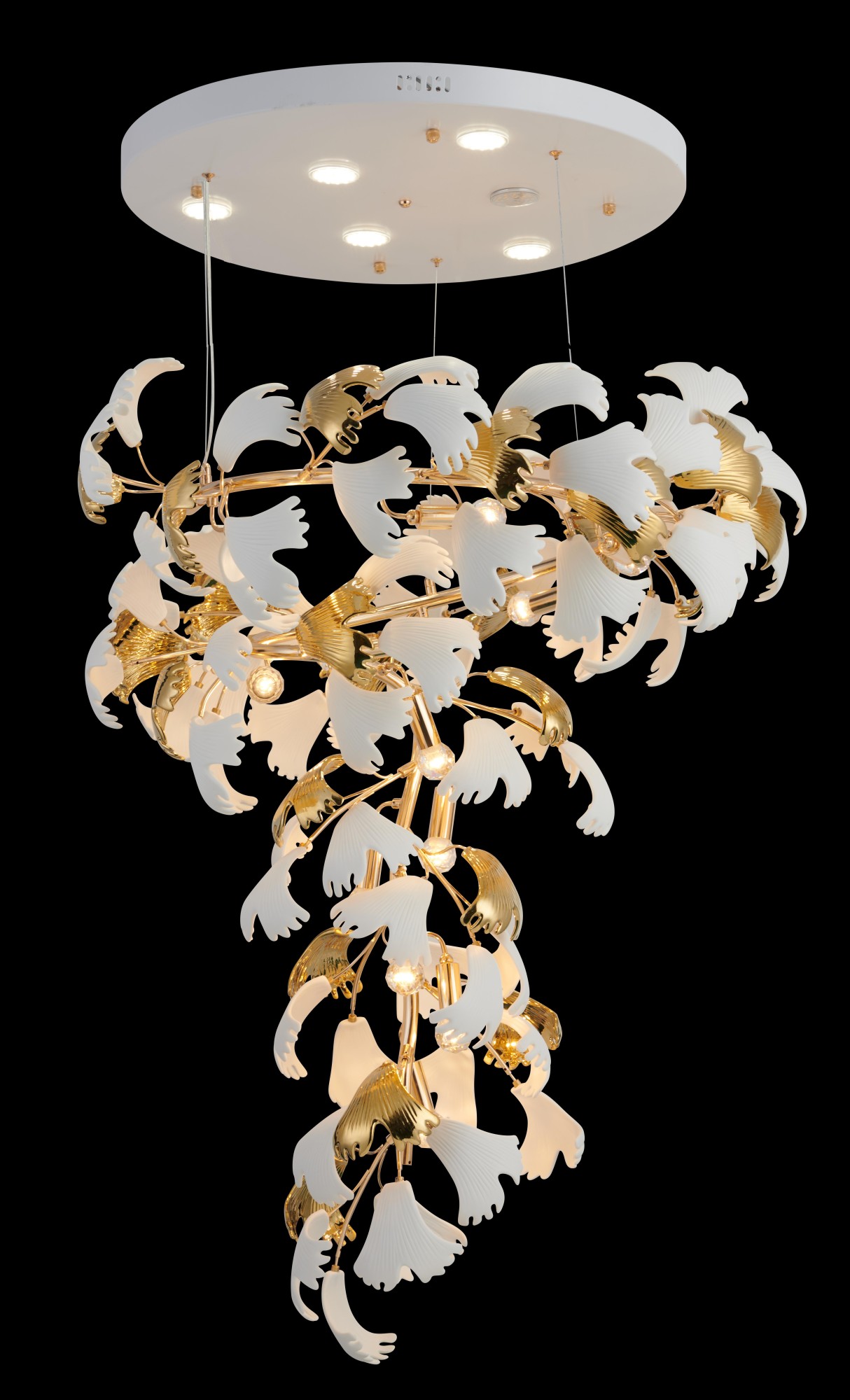 Осветительный прибор сделан в стиле Неоклассика. Задействуются лампочки цоколя E14 мощностью 494 Вт, в количестве 17 ед. Цвет модели F2924-14: Белый,Золотой.