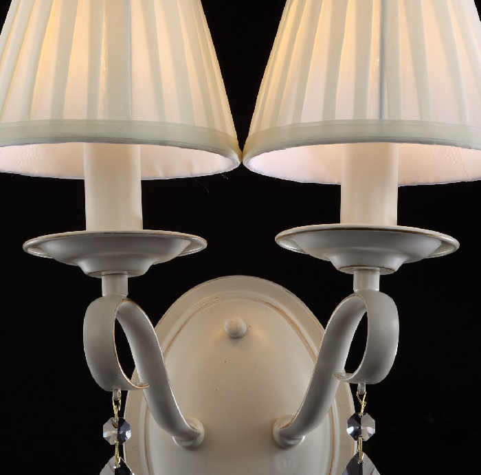 Легкая текстура ткани, подсвеченная лампами накаливания, прекрасно смотрится в оформлении плафонов. Белому цвету текстиля полностью соответствует оттенок кремового золота, который дизайнеры выбрали для металлического каркаса. Изюминкой декора, несомненно, стали крупные капли хрусталя, дарящие пространству мерцающие отблески света.
